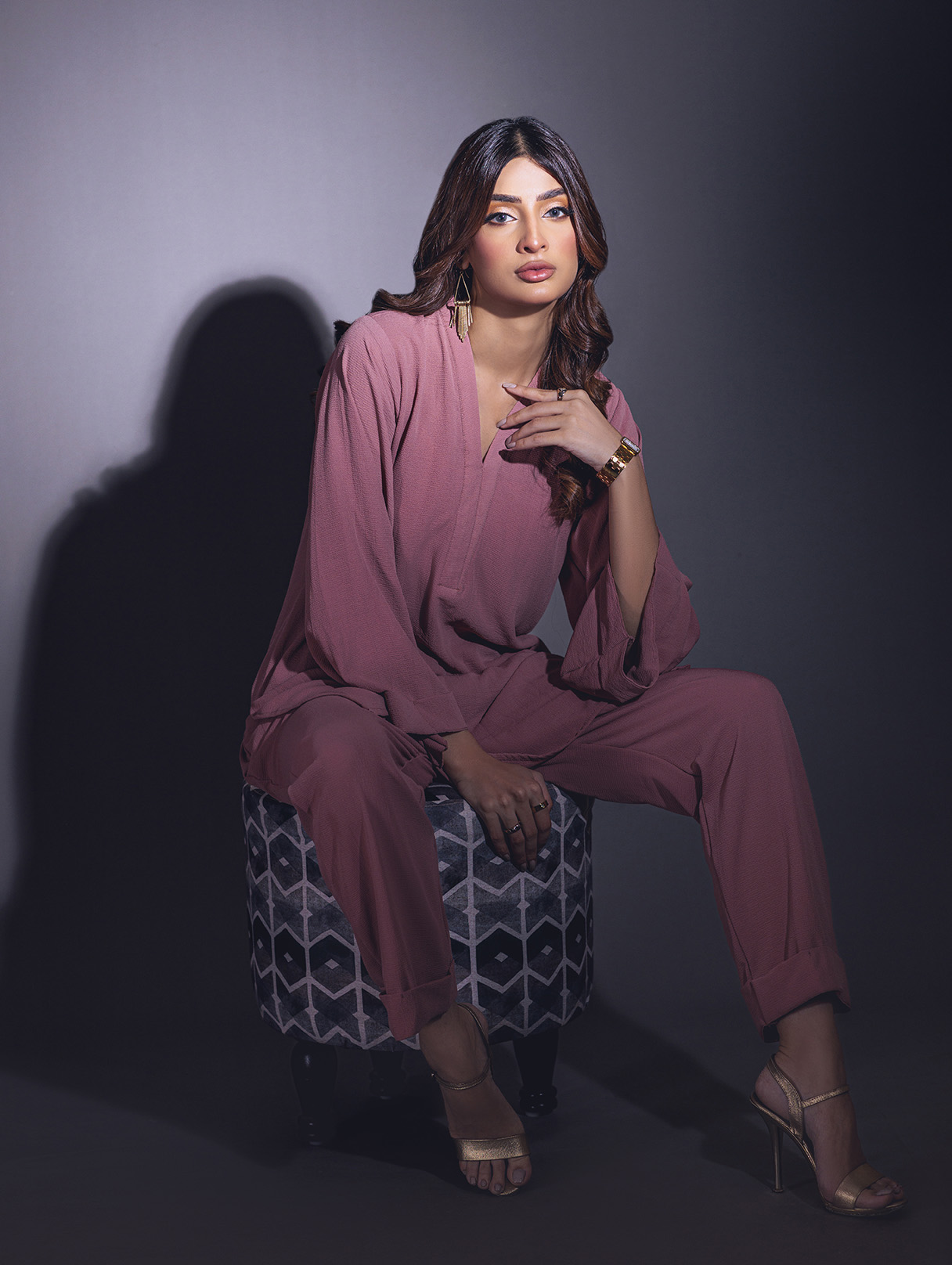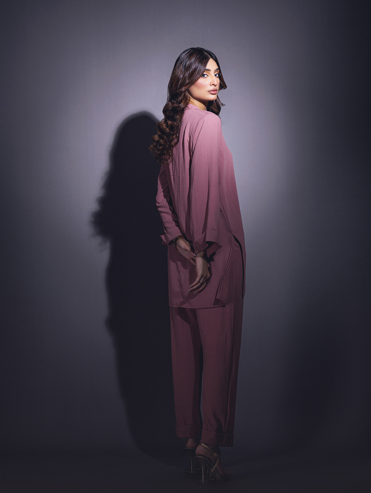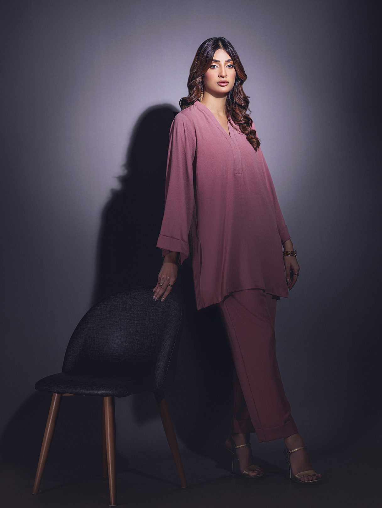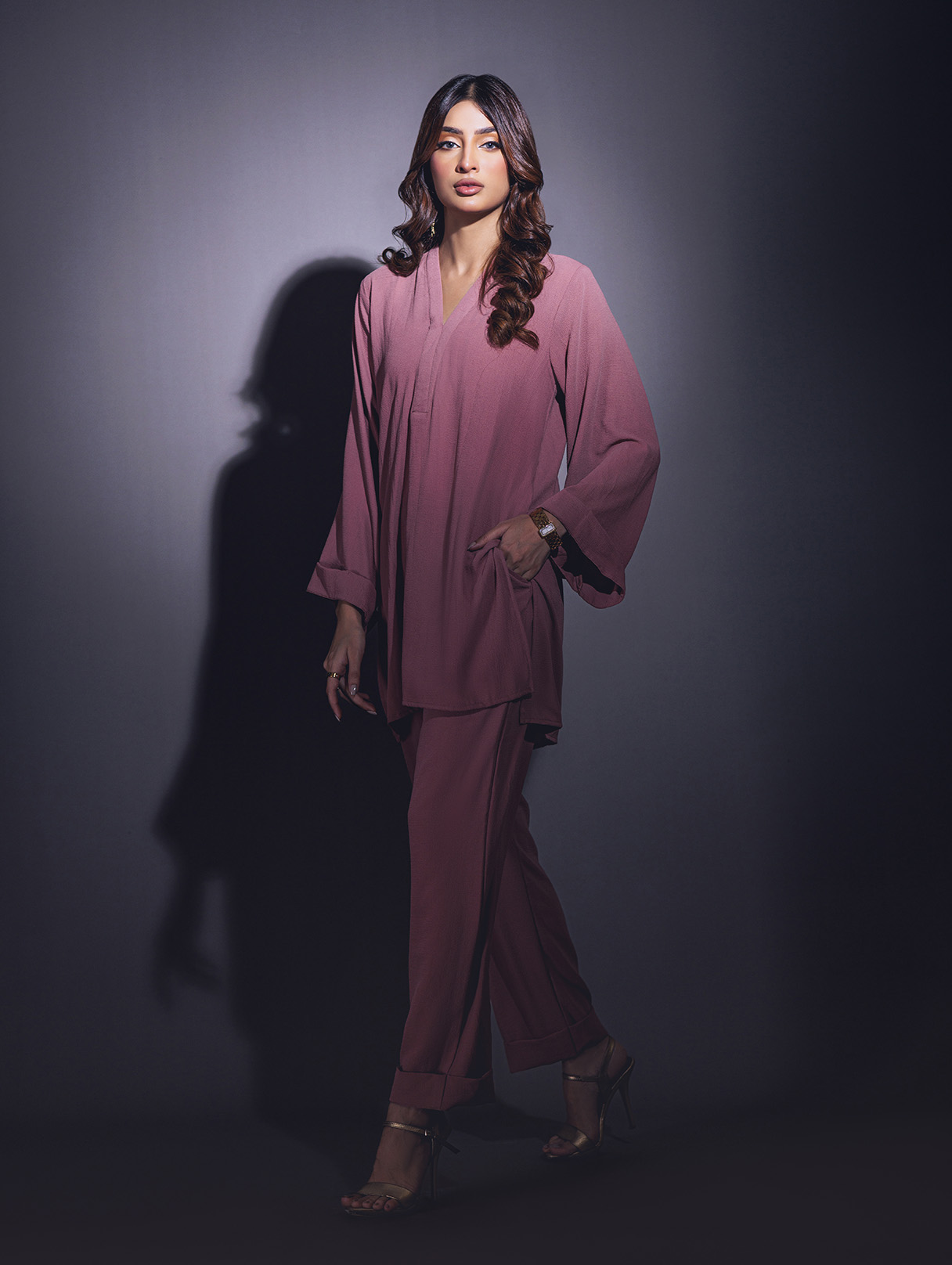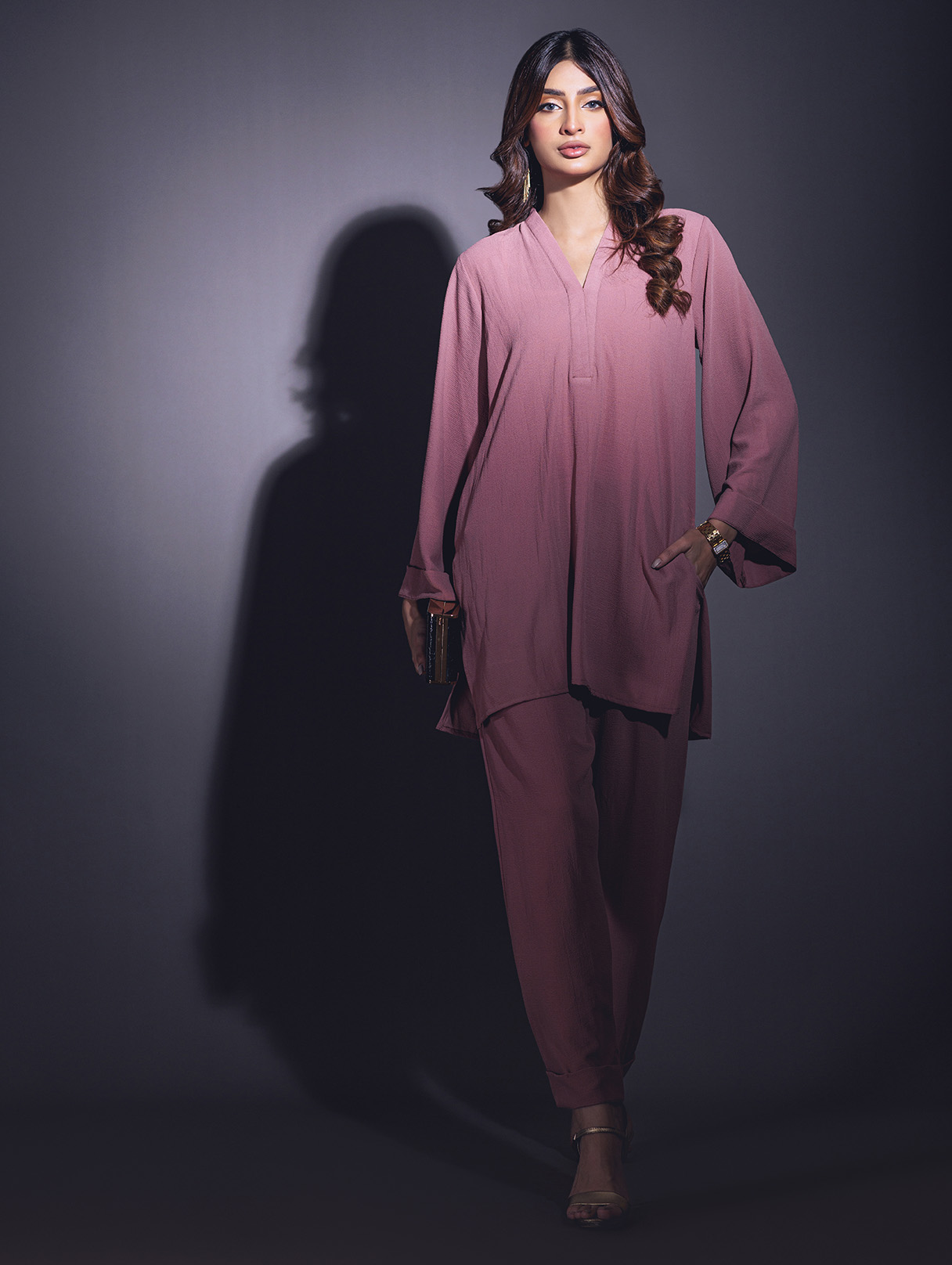 Relaxed sets with some modern take on tailoring in high low hems, V- neckline, Wide sleeves with turn-up detail, solid slit side. As seen paired with Wide leg pants with pockets.