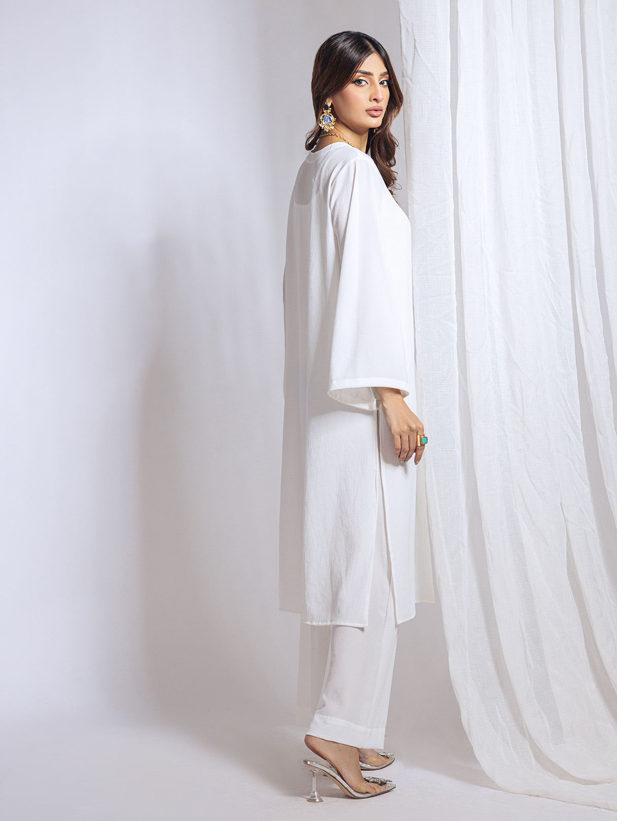 Mother-of-pearl buttons, Flared sleeves, V-neckline, button-down front, short side slit. Wide leg pants with pockets. Garment has transparency and may be worn with camisole for extra coverage.