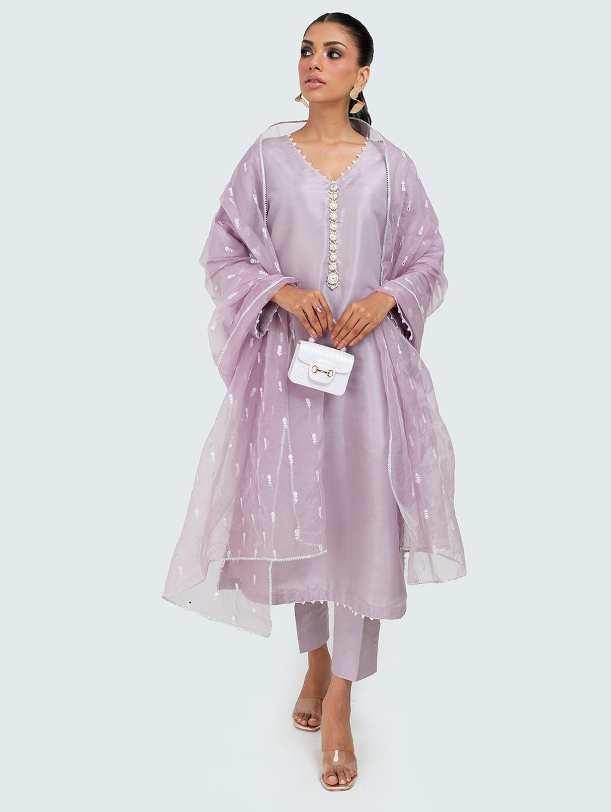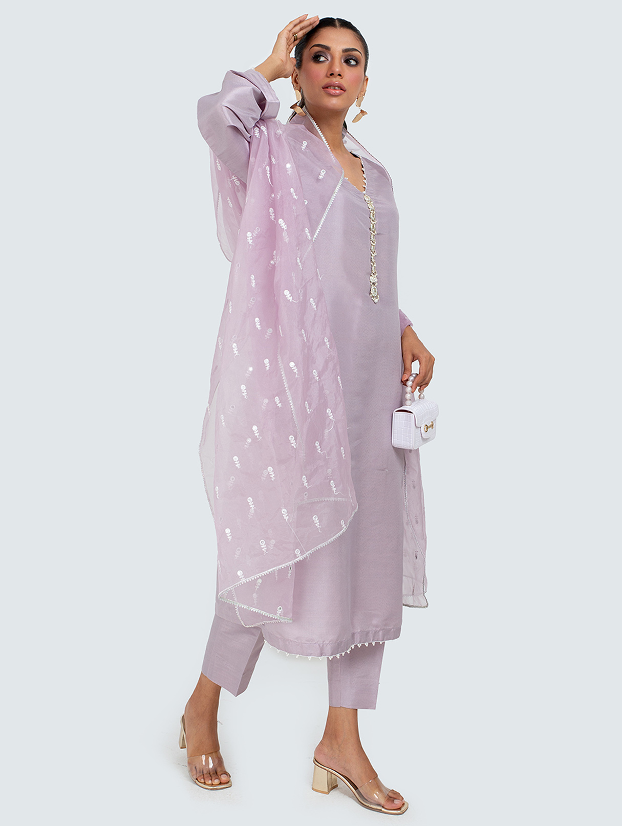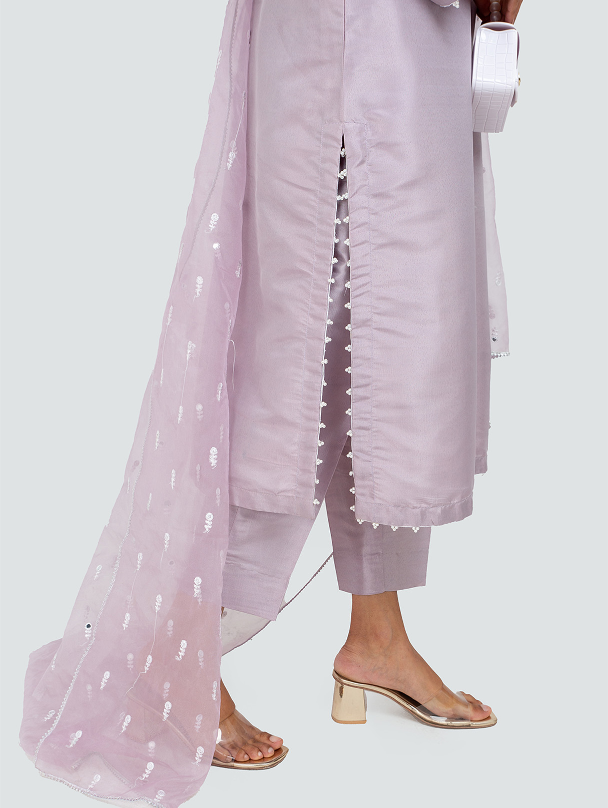 Introducing our elegant Katthan Silk shirt with pearl detailing on damaan, sleeves and neck , paired with Straight Pant. To finish it off, a organza dupatta with lace detailing is added. This set is a perfect blend of traditional charm and modern flair & is sure to make heads turn!