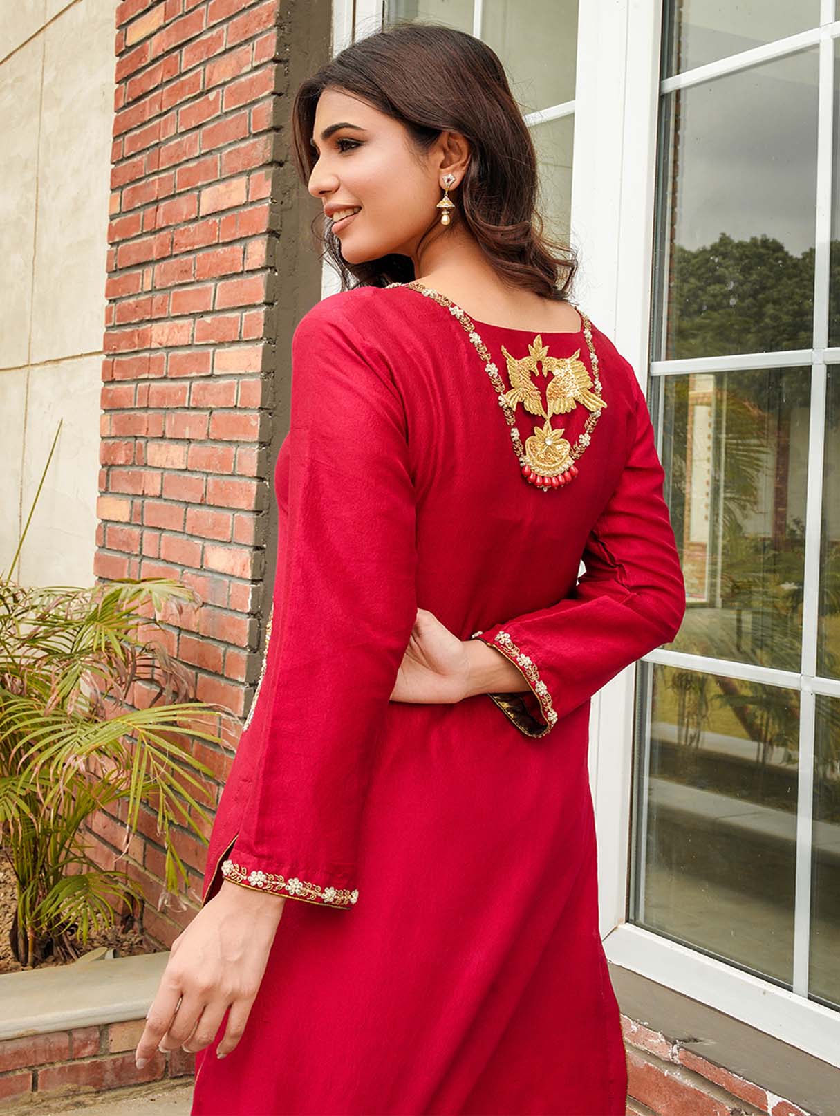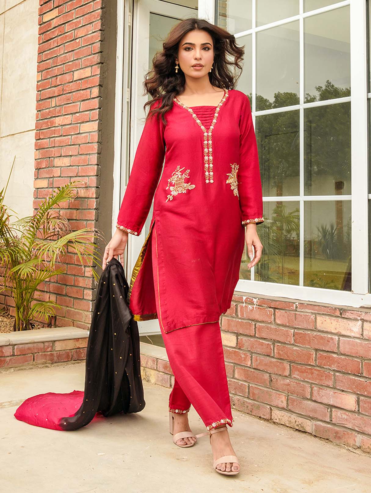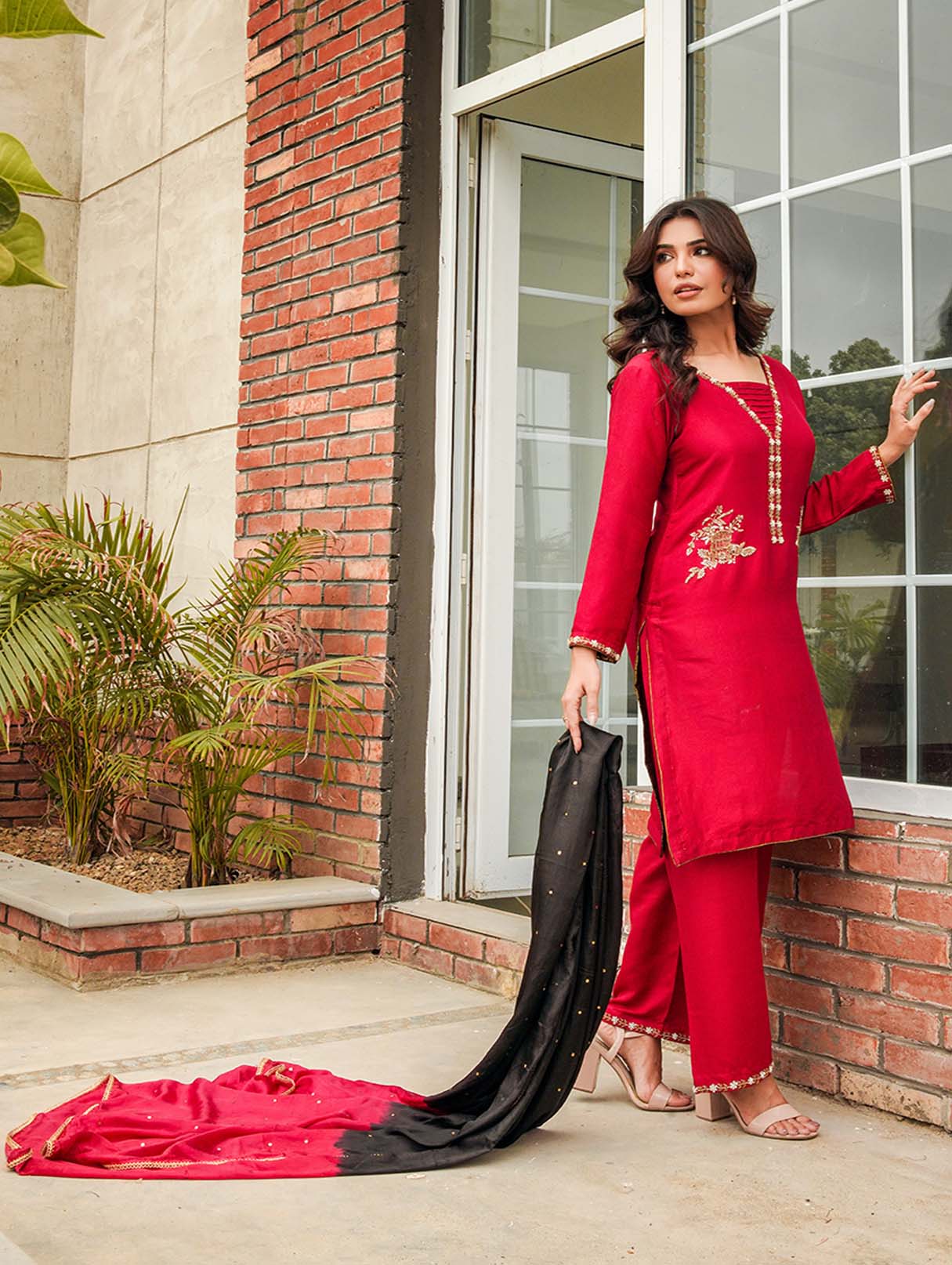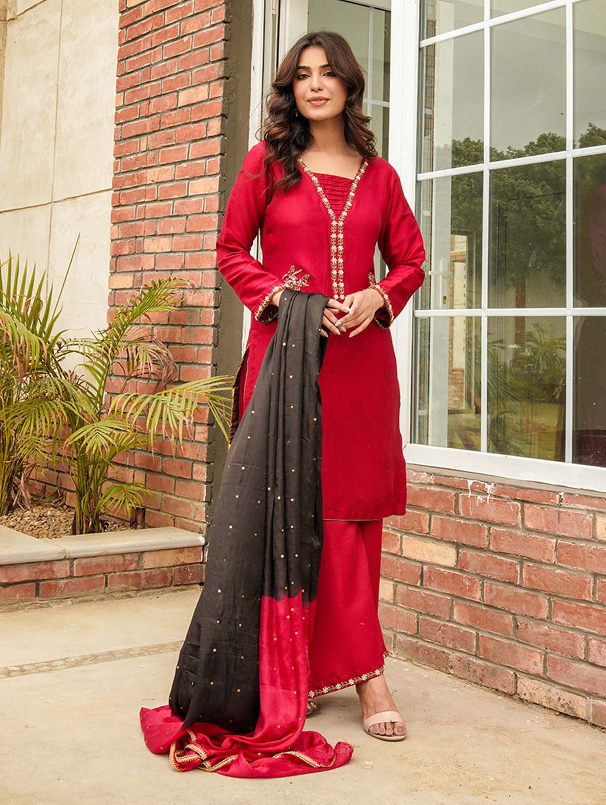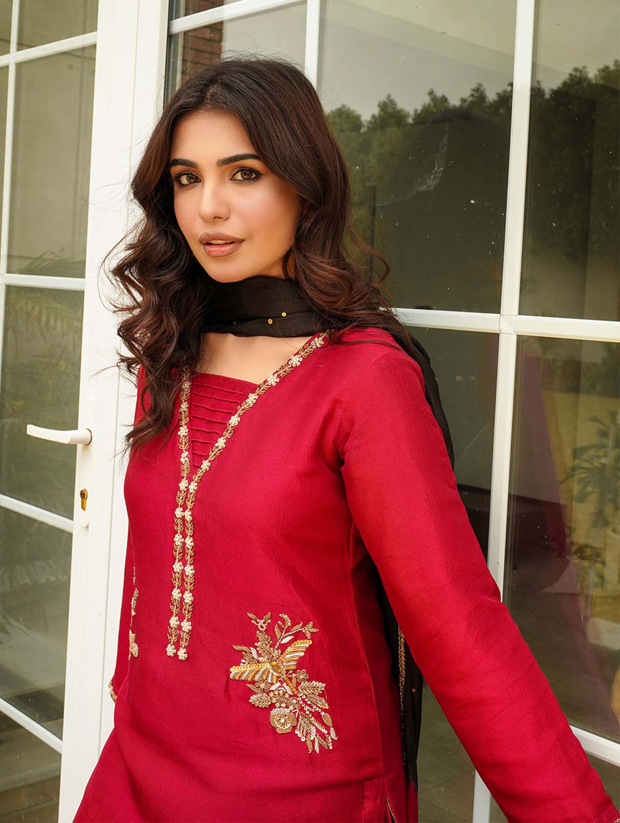 Mehr-o-Maah’ is your radiant choice for weddings. This outfit, beautifully crafted from pure 60gms raw silk canvas with matching culotte pants, detailed neckline, front motifs, and a Pure Silk dupatta that sparkles like a starry night’s with lace finishings, embodying the elegance of handcrafted chan, a beautiful design for your festive events.