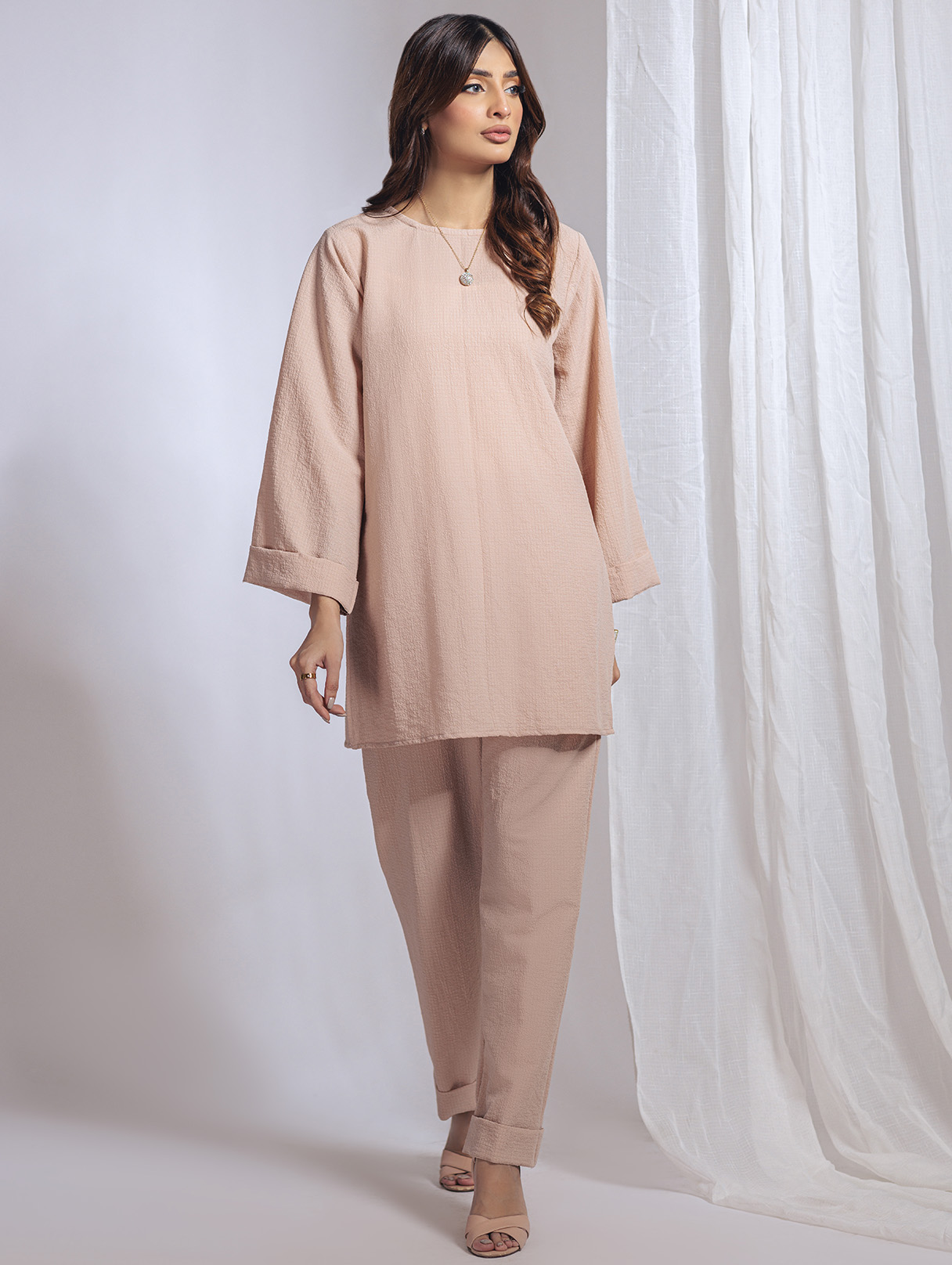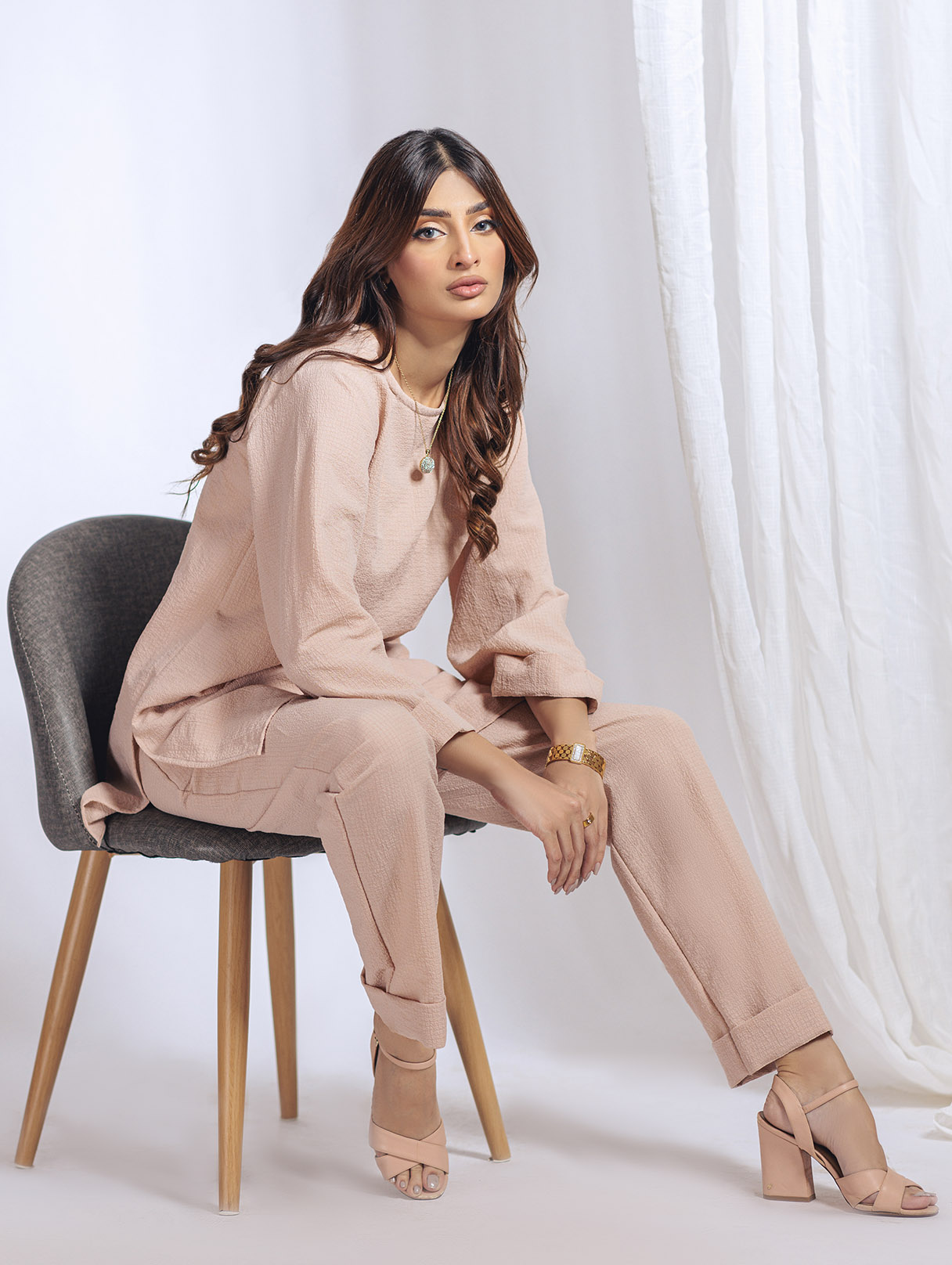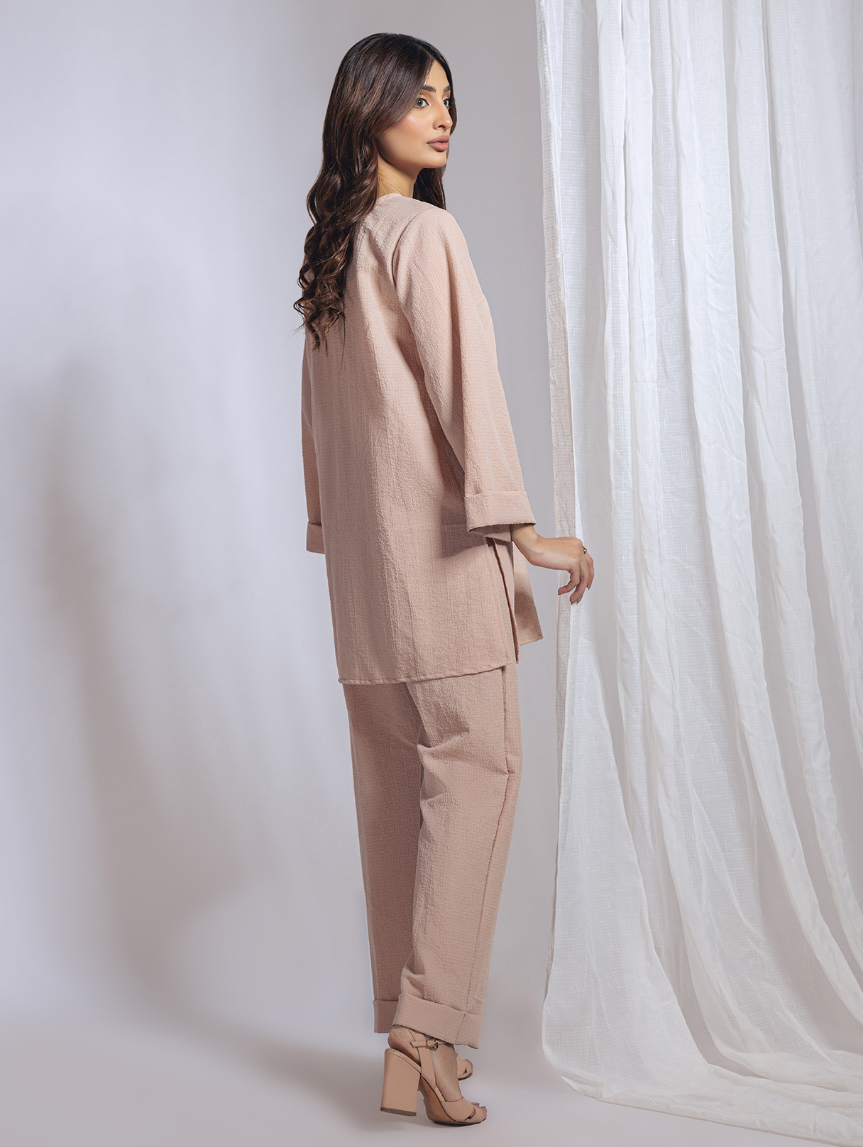 Relaxed sets with some modern take on tailoring in high low hems, round neckline , Wide sleeves with turn-up detail, solid slit side. As seen paired with Wide leg pants with pockets.