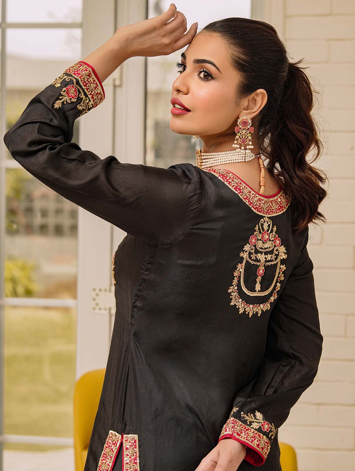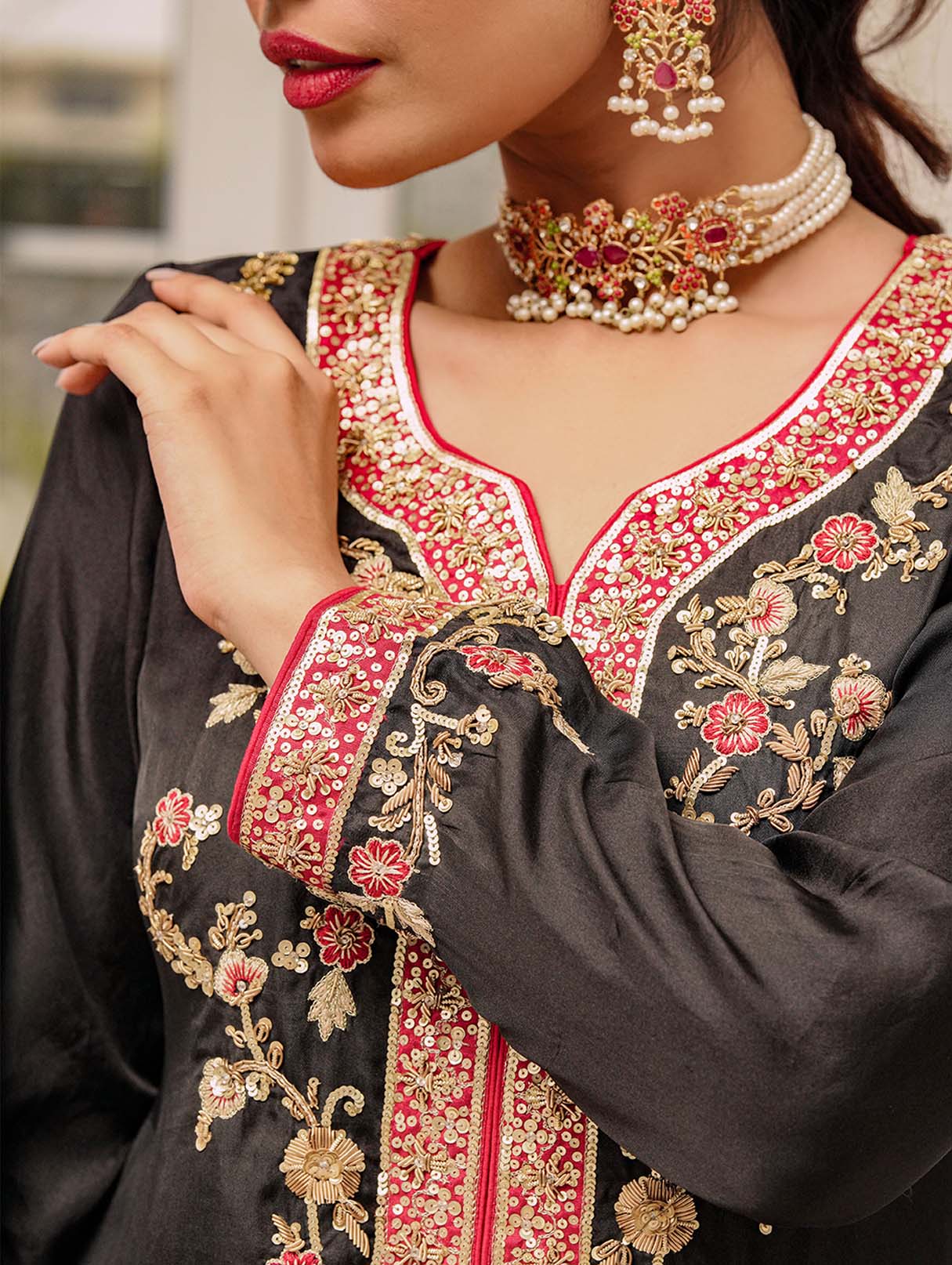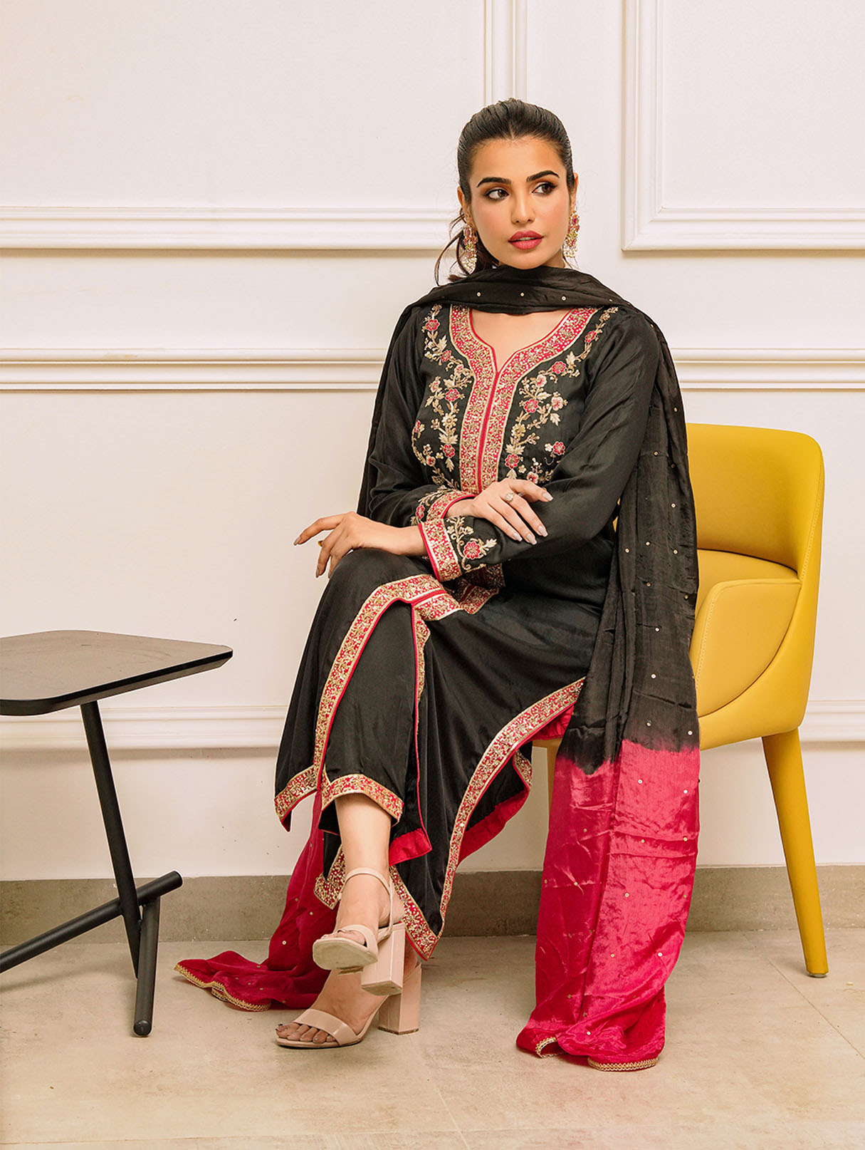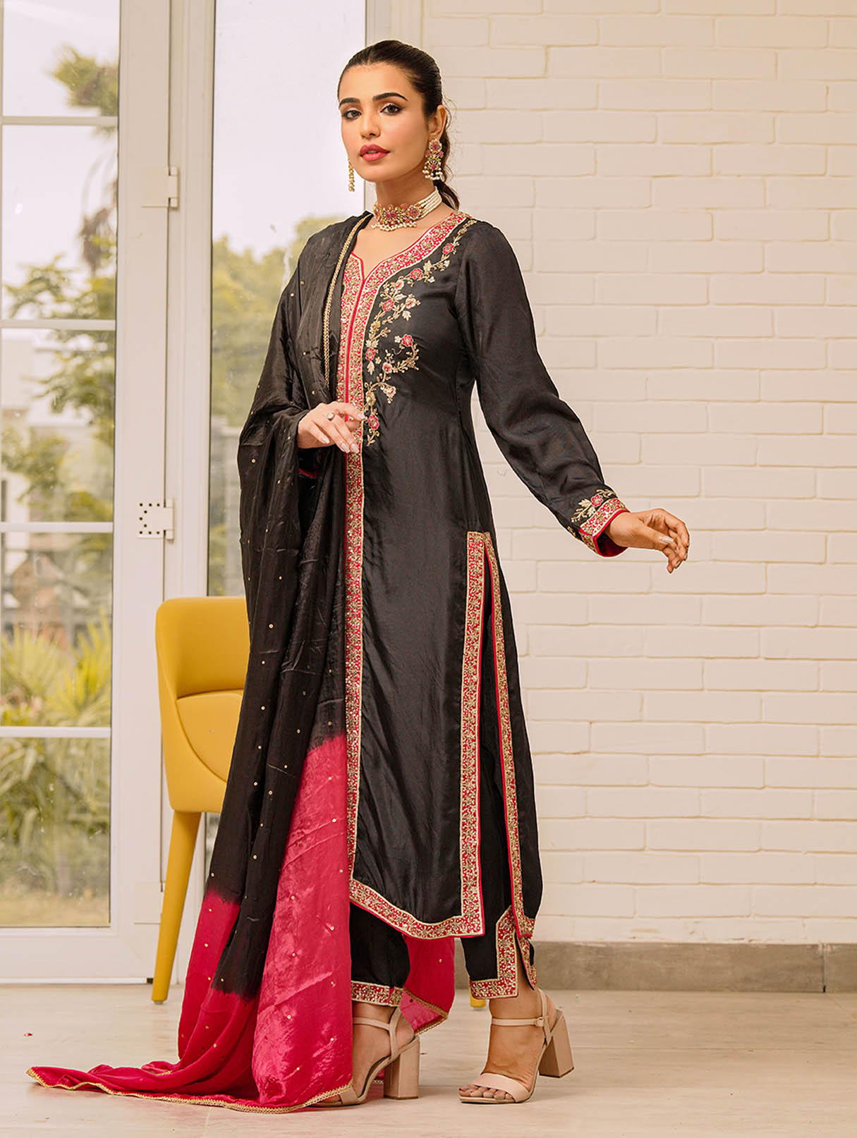 An embodiment of ethereal elegance curated on Black pure raw silk. It depicts a mirage between traditional and contemporary details. Paired with trousers and a fun matching on soft silk dupatta. A beautiful look for the festive season.