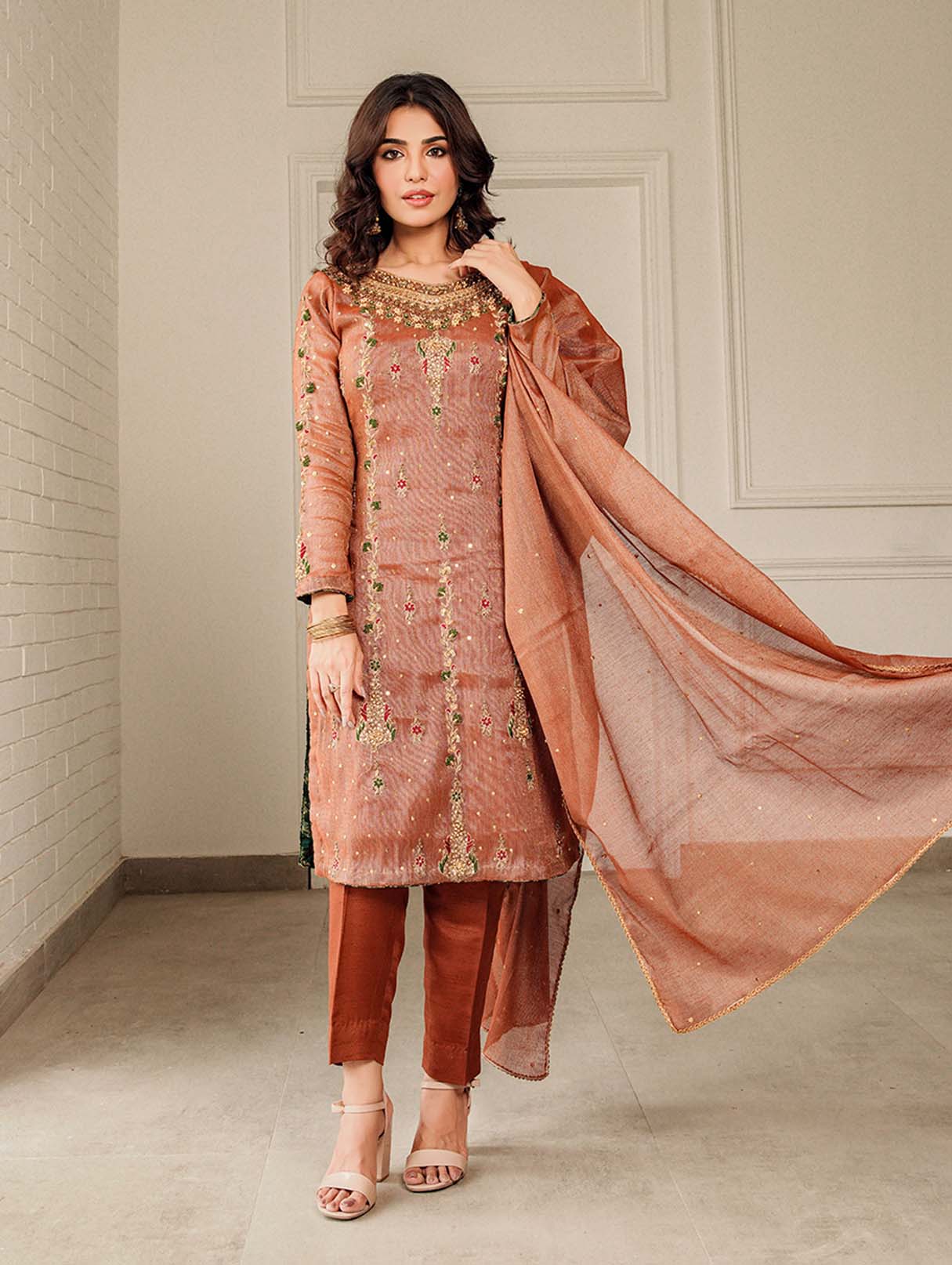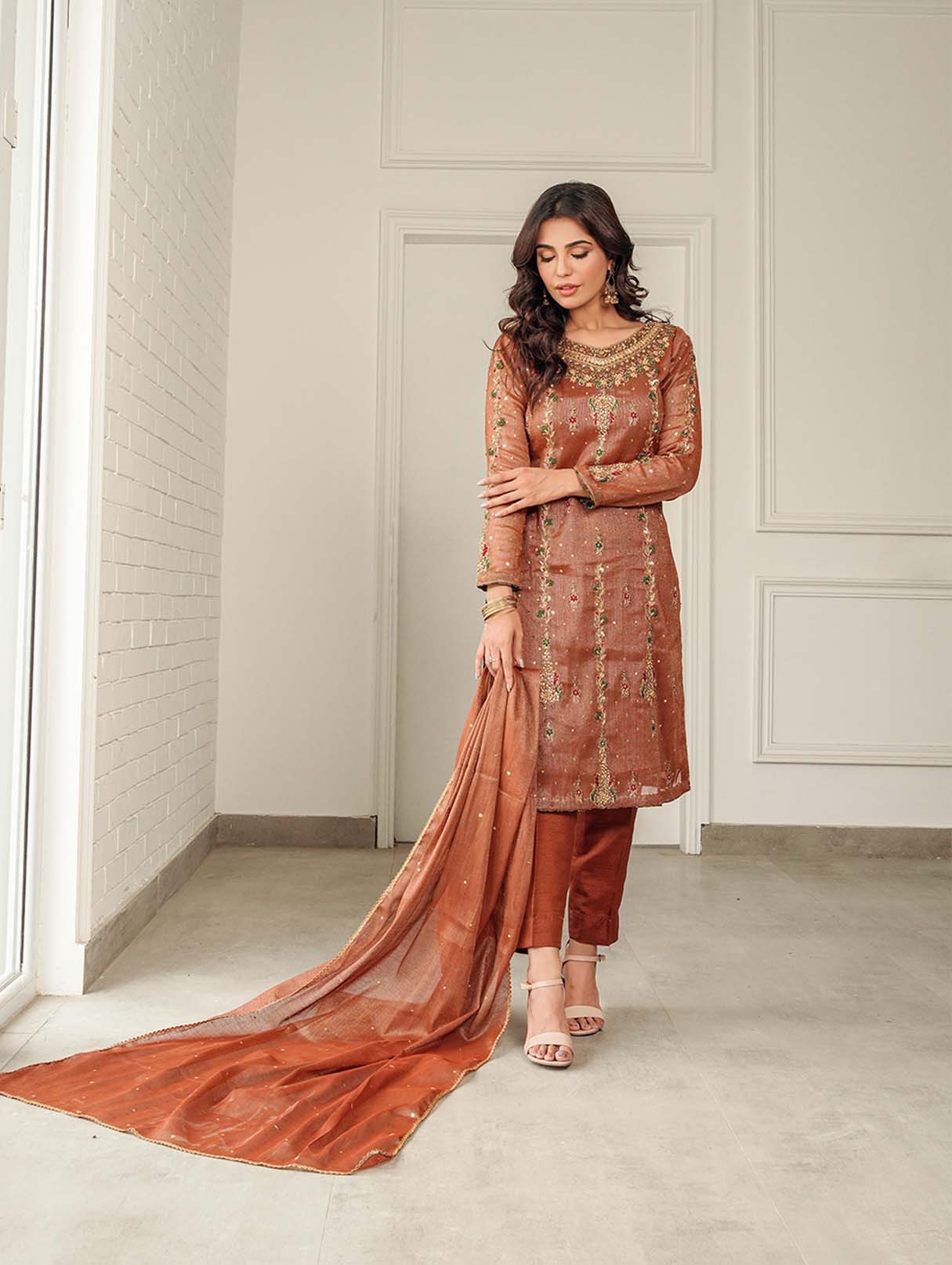Caramel Dreams – Zauhra, a radiant three-piece ensemble for the modern woman. Pure khaadi net dupatta, sequins spray, and a meticulously crafted round neckline make this classic outfit perfect for weddings.